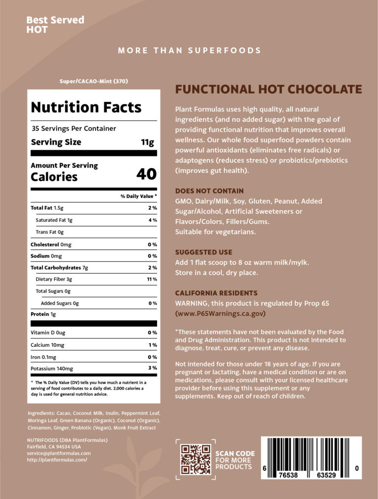 $15.00Our rich tasting and sugar free hot chocolate contains cacao, coconut and moringa superfoods as well as probiotic & prebiotic powders supports a healthy gut